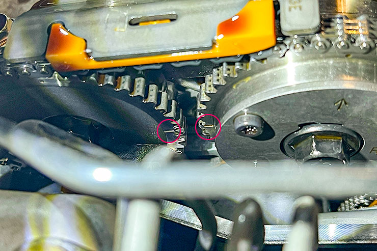 タイミングチェーンのスプロケットに合わせマークがあるのでインテークとエキゾーストをお互いに合わせます。