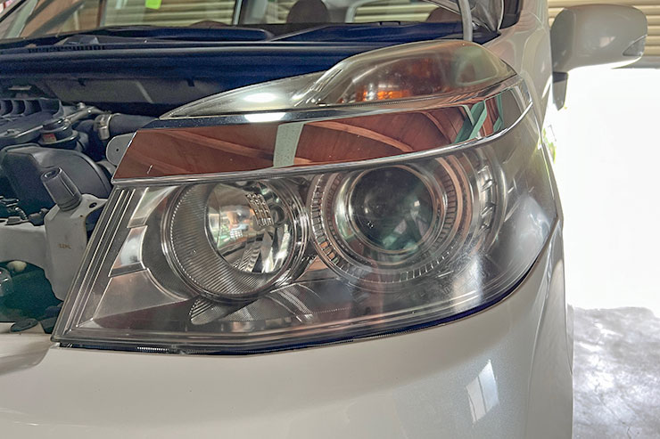 なんだかガサガサなうえに細かいクラックが見えるなと思って叩いてみたらガラスじゃないぞと。最近の車は樹脂レンズになってきているみたいですが、15年前の車でも樹脂レンズがあったとは。