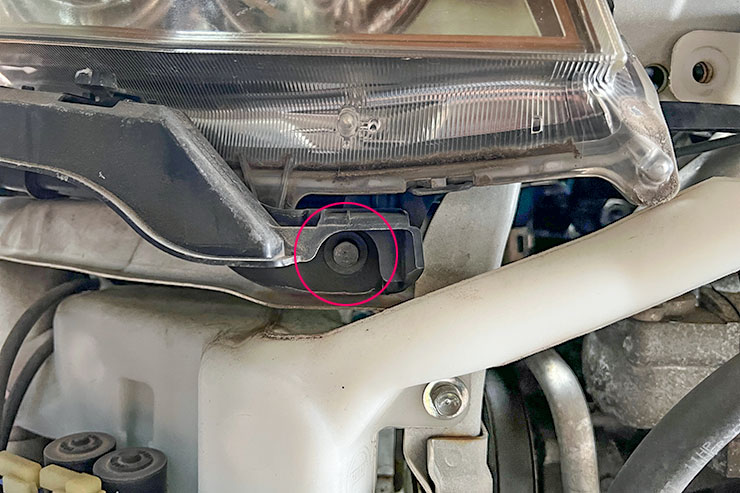 運転席側のフォグランプ灯体の黒い枠?に配線が固定されていましたので引っ張って外しておきます。