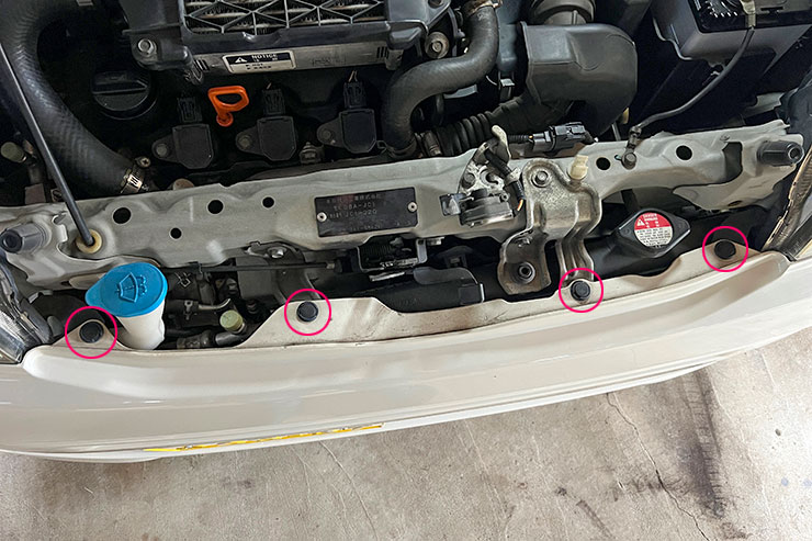フェンダー内側のバンパーとの境くらいに1箇所ビスがあるので左右とも外します。