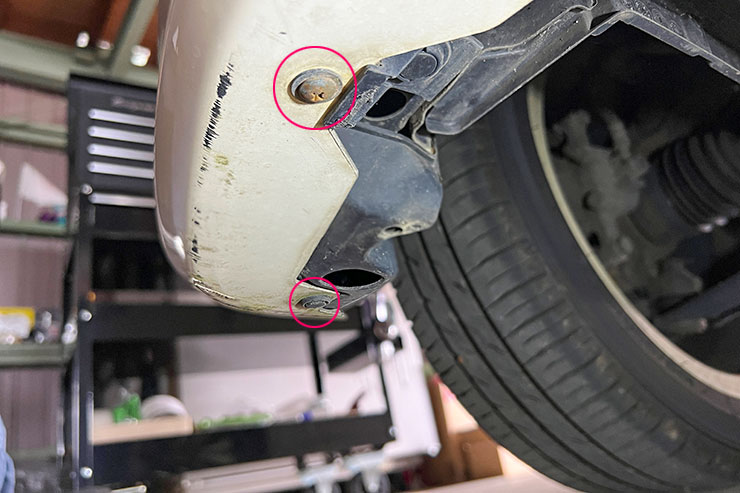 続いてバンパー下を覗いて(潜って)外側の樹脂クリップと内側のビス1本を左右とも外します。