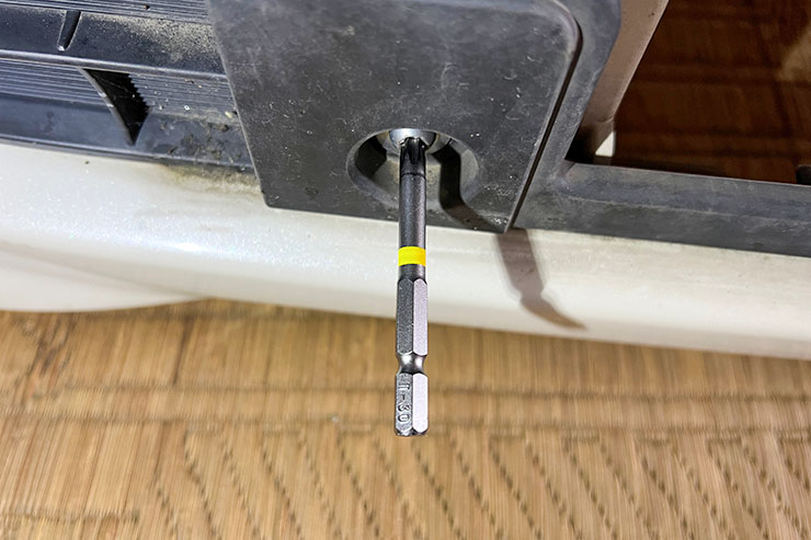 正面内側にボルト1本の計3本で留まっています。全てM6なので10mmのソケットあたりがよろしいと思います。