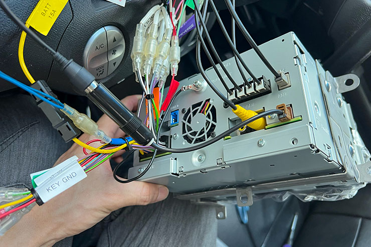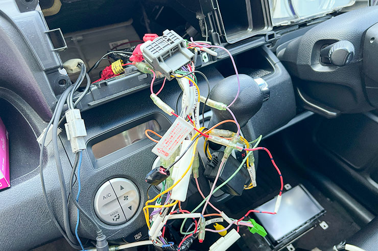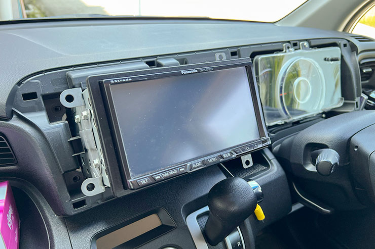 繋げるべきものを全て2DIN開口部に持ってきたらいよいよナビ本体を取り付けます。