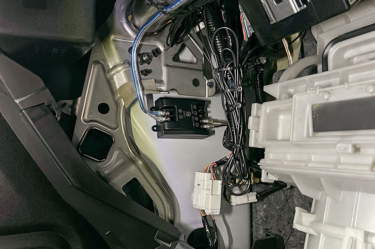 運転席側ネットワークはステアリングコラム下の内張を外して右下ポケットのところに貼り付けました。