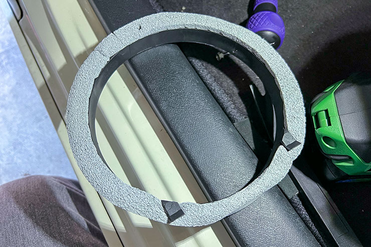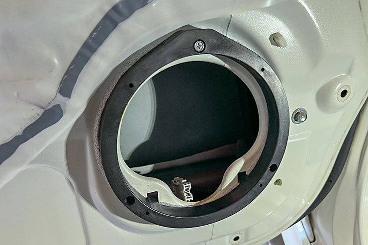 さすがにバッフル2枚重ねとなるとドア内張のスピーカーグリル裏のリブは切り取らないと付きませんでした。おそらく30mmくらいまでならそれで収まりそうです。