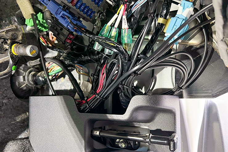 アンテナ配線をAピラーから運転席キックパネルのあたりに落とし込んで、余ったものは丸めて車両ハーネスに固定しておきました。