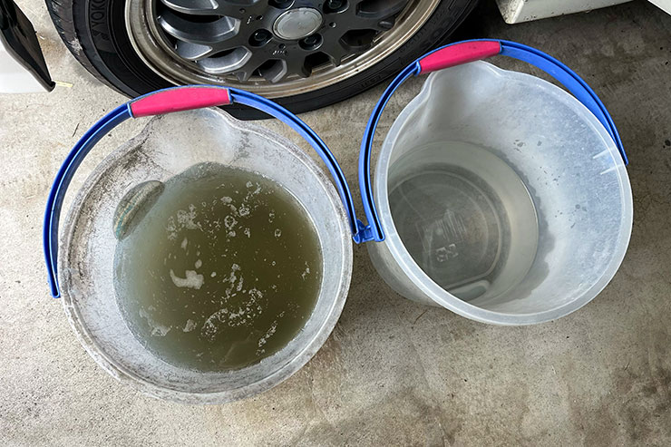 洗浄の結果はご覧の通りで、左が洗浄液の排水で右が最終すすぎの排水になります。