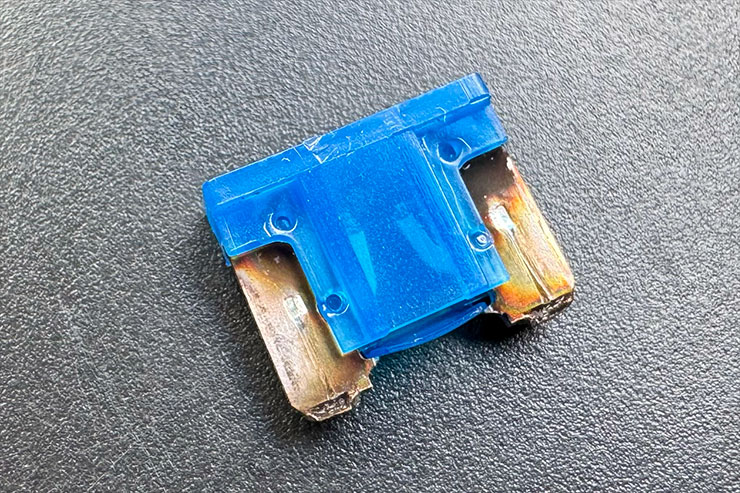 こりゃアース不良か断線か?などと考えてどうしようかなと思っていたのですが、そういえばヒューズ見てないなと思いヒューズボックスから引っこ抜いて確認したのが上記画像です。