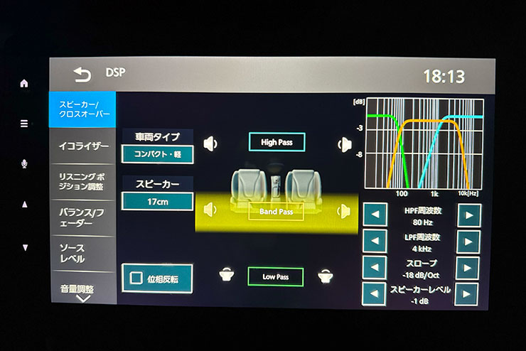 ツイーターは付属のネットワークをそのまま繋いであるので特にいじらず、スルーのドアミッドにハイパスとローパス(バンドパス)の設定です。