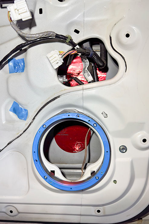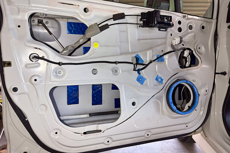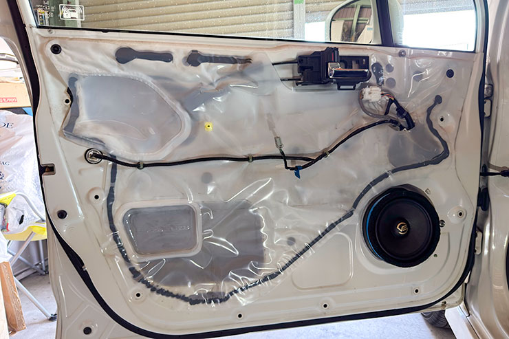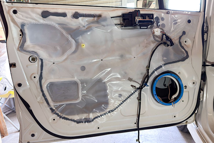 ここでの見所はビニールシートにあえて窪みを作ってあるところでしょうか。サービスホールを塞ぐときに同じように凹ませないと内張が当たります。